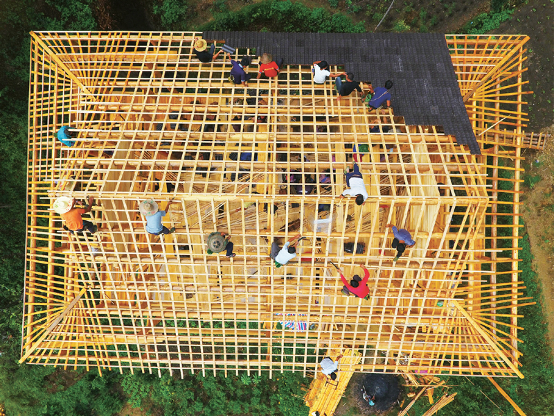 全面小康大家一起走。廣東廉江市和廣西融水苗族自治縣自2017年9月結(jié)成對(duì)子,開展“攜手奔小康”幫扶工作,針對(duì)山區(qū)群眾建房材料運(yùn)輸成本高等實(shí)際困難,加大對(duì)貧困群眾危舊房改造的補(bǔ)助力度,幫助他們實(shí)現(xiàn)安居夢(mèng)。圖為2019年9月3日,在黔桂烏英苗寨,群眾正在幫助貧困戶修建新木樓。 新華社記者 黃孝邦/攝