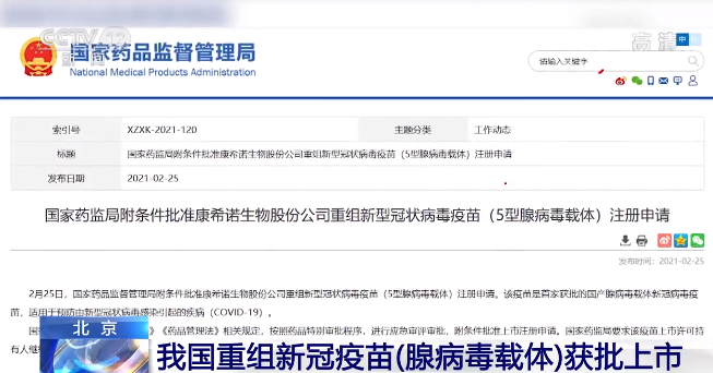 25日,國(guó)家藥監(jiān)局根據(jù)《疫苗管理法》和《藥品管理法》的相關(guān)規(guī)定,按照藥品特別審批程序,進(jìn)行應(yīng)急審評(píng)審批,附條件批準(zhǔn)了重組新冠疫苗(腺病毒載體)的上市注冊(cè)申請(qǐng),并要求上市許可持有人繼續(xù)開(kāi)展相關(guān)研究工作,完成附條件的要求,及時(shí)提交后續(xù)研究結(jié)果。