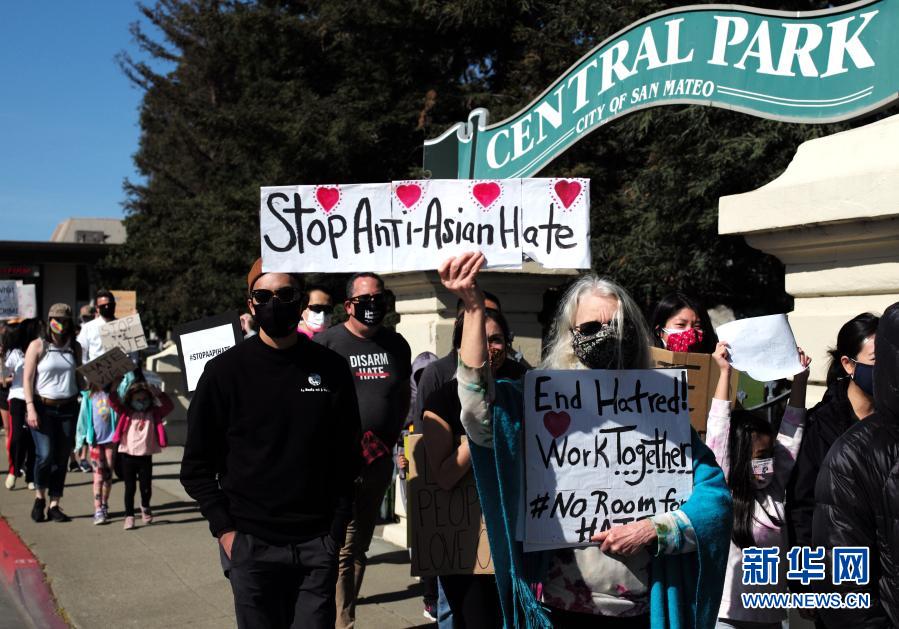 2月27日,在美國加利福尼亞州舊金山灣區(qū)圣馬特奧市,人們參加集會反對針對亞裔的歧視行為和仇恨犯罪。