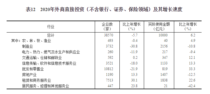 2020年外商直接投資(不含銀行、證券、保險(xiǎn)領(lǐng)域)新設(shè)立企業(yè)38570家,比上年下降5.7%。實(shí)際使用外商直接投資金額10000億元,增長(zhǎng)6.2%,折1444億美元,增長(zhǎng)4.5%。其中“一帶一路”沿線國(guó)家對(duì)華直接投資(含通過(guò)部分自由港對(duì)華投資)新設(shè)立企業(yè)4294家,下降23.2%;對(duì)華直接投資金額574億元,下降0.3%,折83億美元,下降1.8%。2020年高技術(shù)產(chǎn)業(yè)實(shí)際使用外資2963億元,增長(zhǎng)11.4%,折428億美元,增長(zhǎng)9.5%。