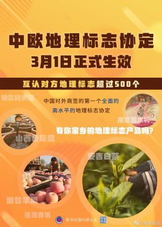 新華社北京3月1日電(記者 于佳欣)中歐地理標(biāo)志協(xié)定今起生效。首批“上榜”的中歐各100個(gè)地理標(biāo)志即日起受到保護(hù),這意味著中國(guó)和歐盟的更多特色優(yōu)質(zhì)名品將進(jìn)入彼此市場(chǎng),不僅將更好保護(hù)中歐企業(yè)權(quán)益,也會(huì)讓雙方消費(fèi)者買得放心。