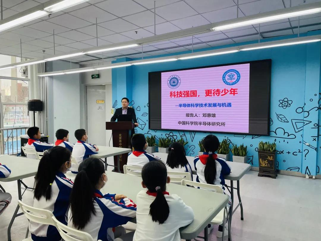 同時(shí),幾位中科院的“講師”從個(gè)人經(jīng)歷及工作內(nèi)容出發(fā),引導(dǎo)學(xué)生在深化對(duì)時(shí)代和科技了解認(rèn)識(shí)的過程中,厚植愛國主義情懷。來自中科院電工所張斌彬引導(dǎo)學(xué)生《我愛我的祖國》,號(hào)召同學(xué)們從小認(rèn)識(shí)自己的祖國,了解自己的祖國,熱愛自己的祖國,做一個(gè)堂堂正正的中國人;中科院電工所丁發(fā)柱講述《我們?yōu)槭裁炊鴮W(xué)習(xí)》,談自己留學(xué)美國的見聞,感受到祖國的強(qiáng)大,激勵(lì)學(xué)生長大以科技報(bào)效祖國;中科院信息工程所岳銀亮圍繞大數(shù)據(jù)、人工智能、網(wǎng)絡(luò)空間安全,為同學(xué)們做科普?qǐng)?bào)告,鼓勵(lì)同學(xué)們從小心懷夢(mèng)想,長大建設(shè)祖國。