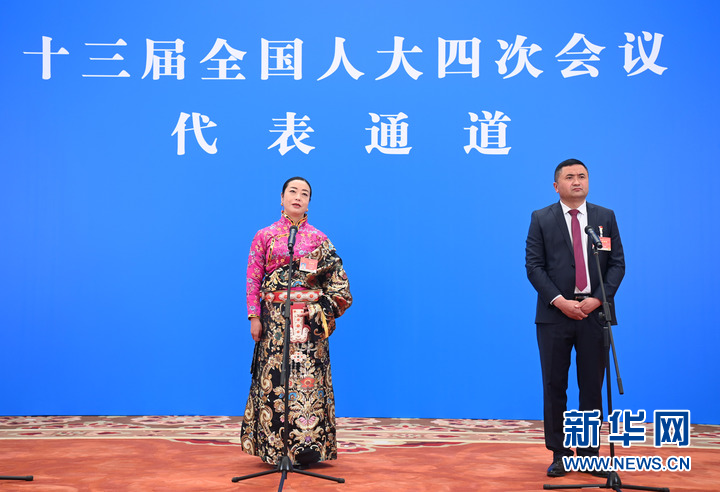 3月5日,第十三屆全國人民代表大會第四次會議舉行首場“代表通道”采訪活動。這是全國人大代表蘇伯民(左)、查艷通過網(wǎng)絡(luò)視頻方式接受采訪。新華社記者 金良快 攝