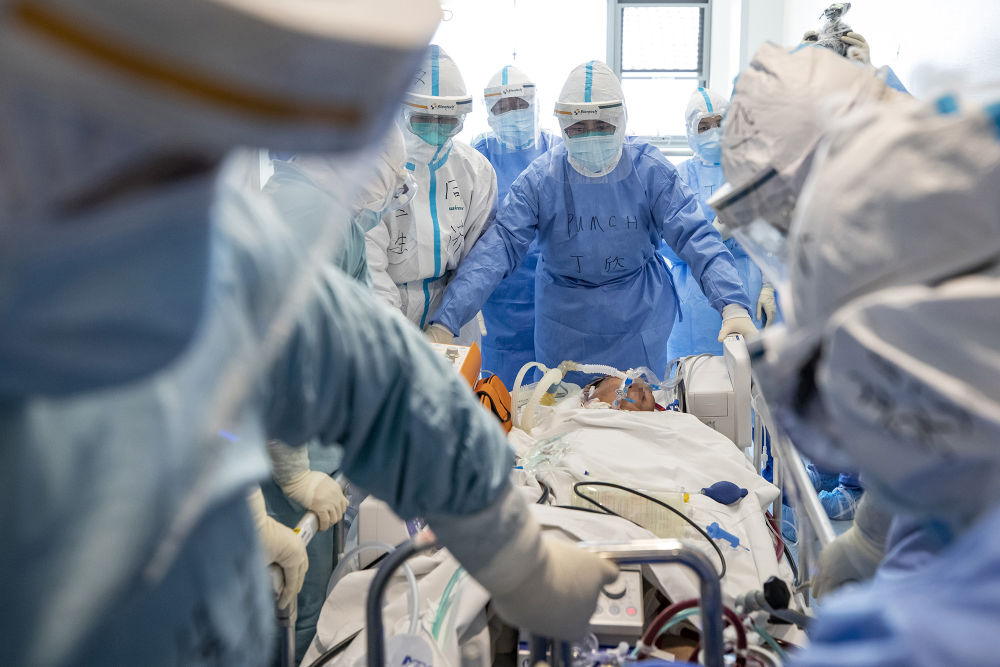 ↑2020年4月12日,北京協(xié)和醫(yī)院醫(yī)療隊(duì)隊(duì)員與武漢同濟(jì)醫(yī)院醫(yī)務(wù)人員共同將一名新冠肺炎危重癥患者轉(zhuǎn)往武漢同濟(jì)醫(yī)院中法新城院區(qū)ICU。在轉(zhuǎn)運(yùn)過程中,ECMO(人工膜肺)治療仍在持續(xù)進(jìn)行。