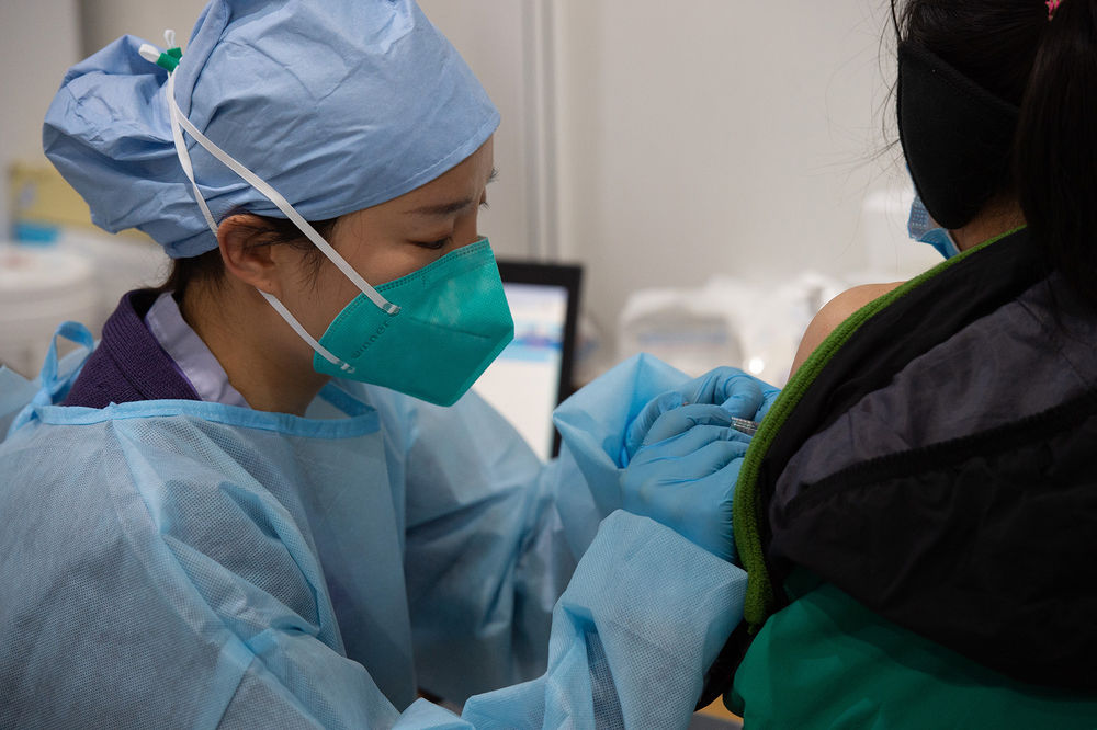 ↑2021年1月2日,在北京市朝陽區(qū)一臨時接種點(diǎn),醫(yī)護(hù)人員為接種人員注射新冠病毒疫苗。