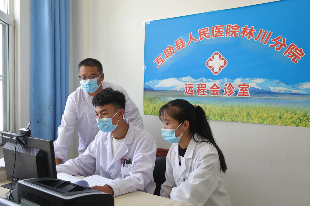 ↑在青海省海東市互助土族自治縣林川衛(wèi)生院遠(yuǎn)程會診室,醫(yī)生盛生凱(左二)和同事在連線互助縣人民醫(yī)院專家(2020年9月10日攝)。