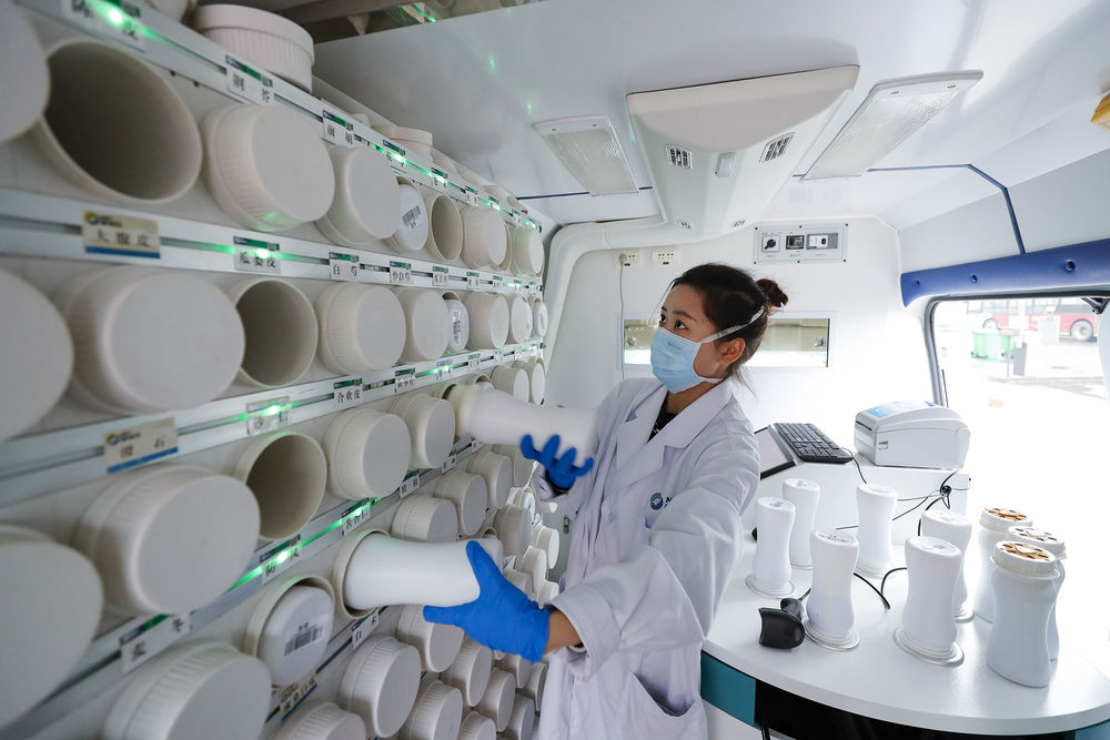 ↑2020年2月26日,在武漢江夏方艙醫(yī)院院內(nèi)的“流動應(yīng)急智能中藥房”里,系統(tǒng)把藥方中包含的單味藥用綠燈標(biāo)識出來,工作人員將這些盛有單味中藥濃縮顆粒的藥瓶取下來準(zhǔn)備制藥。江夏方艙醫(yī)院是武漢首個以中醫(yī)院運(yùn)轉(zhuǎn)模式來進(jìn)行臨床治療、管理的方艙醫(yī)院。