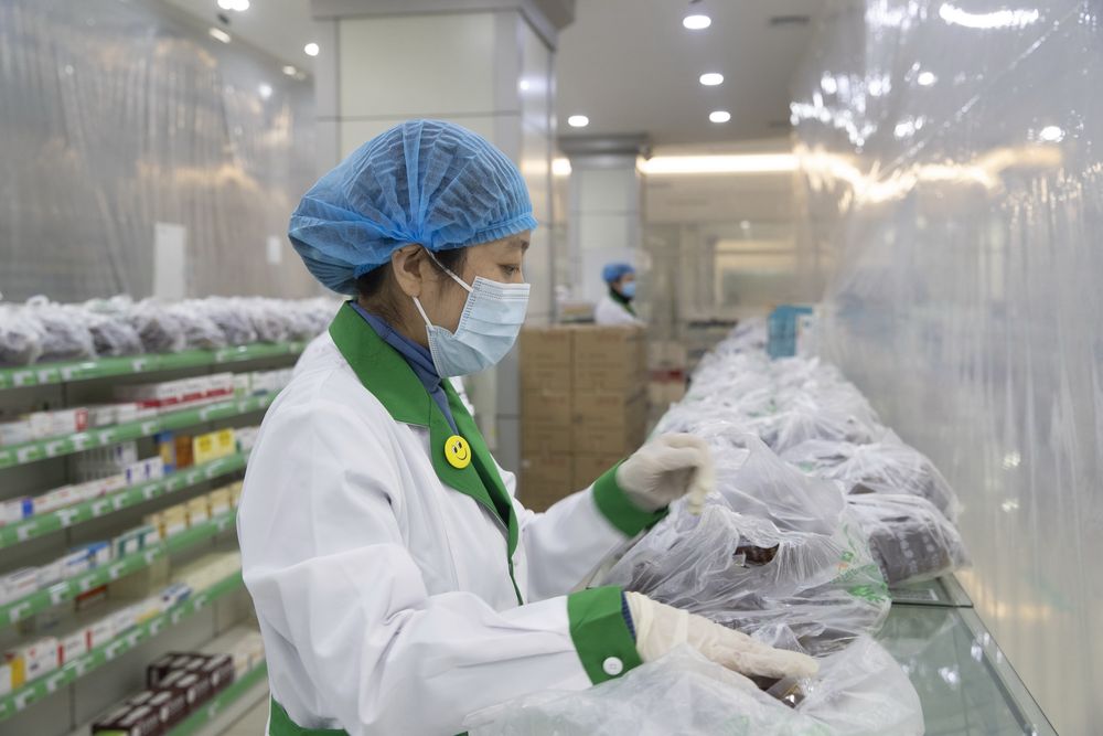 ↑2021年1月25日,在黑龍江綏化市泰華大藥房內(nèi),工作人員打包中藥湯劑。為應(yīng)對新冠肺炎疫情,綏化市指定醫(yī)藥企業(yè)代煎中藥湯劑送往市內(nèi)各個集中隔離點(diǎn)。