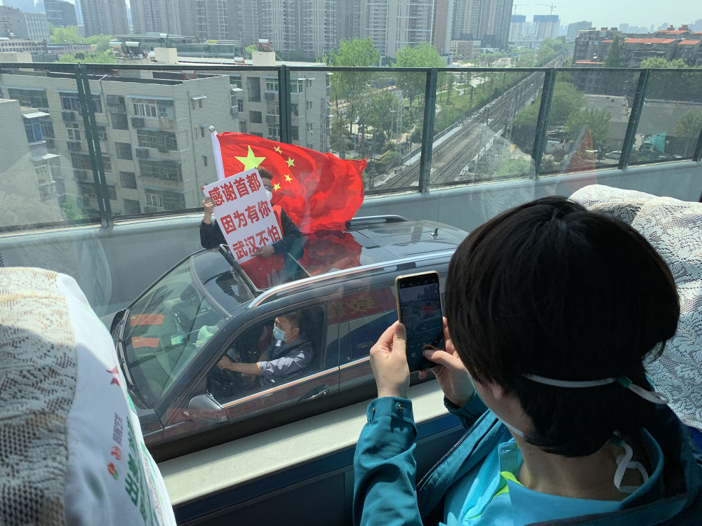 ↑2020年4月15日,武漢市民自發(fā)上街送別北京協(xié)和醫(yī)院國家援鄂抗疫醫(yī)療隊(duì)。