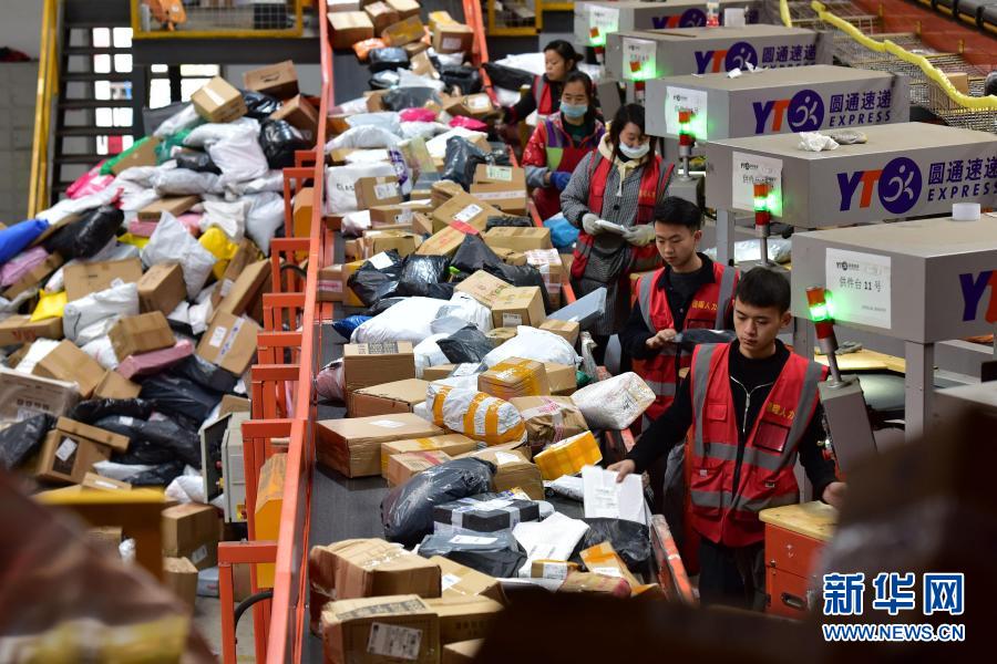 2020年11月3日,在位于貴州省龍里縣的貴州快遞物流園圓通速遞貴州分撥中心,工作人員分揀貨件。新華社發(fā)(龍毅 攝)