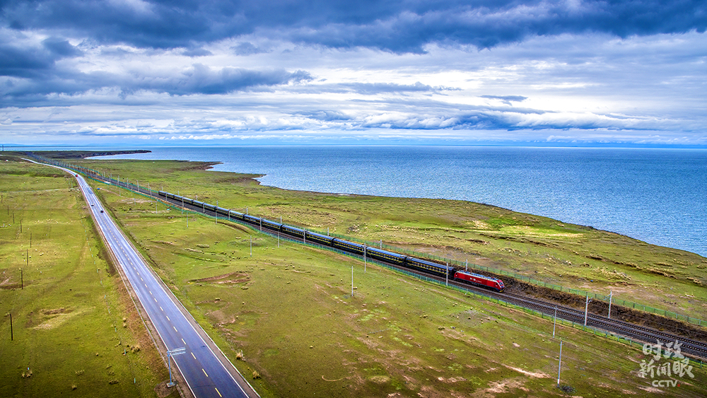 △駛過青海湖畔的青藏鐵路西格段特快列車