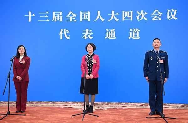 全國(guó)人大代表袁晶、郭艷玲、余海龍(從左至右)通過(guò)網(wǎng)絡(luò)視頻方式接受采訪。新華社記者 金良快 攝