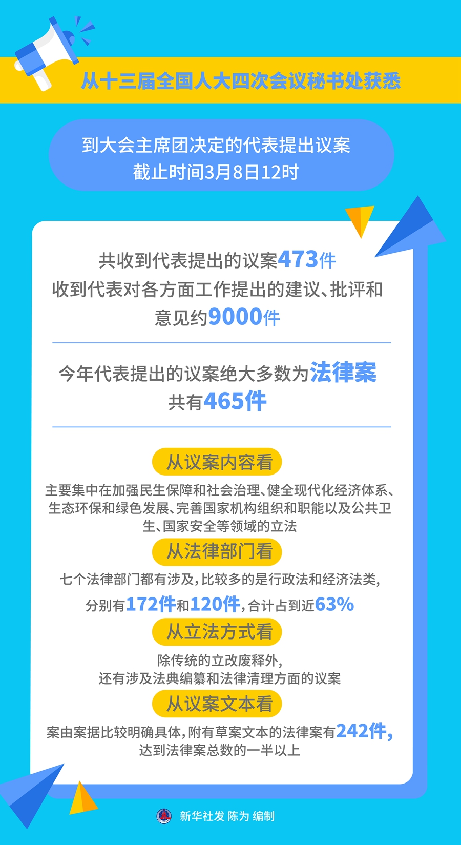 十三屆全國人大四次會議收到代表議案473件 收到代表建議約9000件