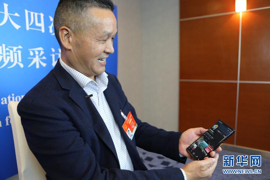 3月3日,全國人大代表、福建永泰縣希安油茶專業(yè)合作社負(fù)責(zé)人盧玉勝在駐地接受采訪時展示他為宣傳油茶開通的社交媒體賬號。新華社記者 吳雨 攝