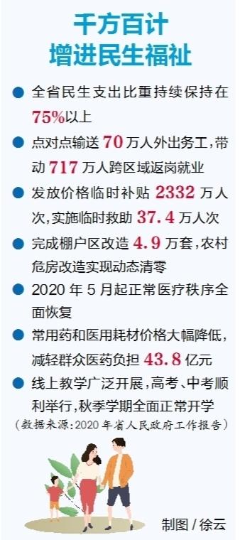 看就業(yè)保障——全省點對點輸送70萬人外出務(wù)工,帶動717萬人跨區(qū)域返崗就業(yè),援企穩(wěn)崗660萬個次,開發(fā)扶貧公益崗位31.4萬個;多渠道多方式幫助高校畢業(yè)生、退役軍人等重點群體就業(yè)。