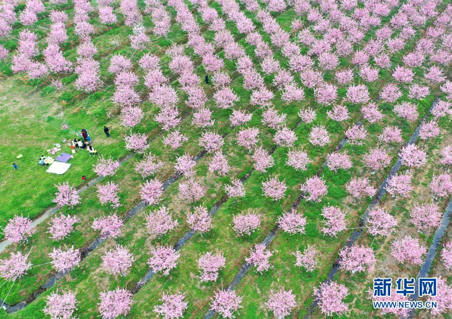 3月13日,游客在全椒縣馬廠鎮(zhèn)龍山櫻花園踏青游玩(無(wú)人機(jī)照片)。