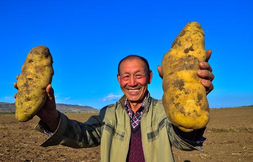 內(nèi)蒙古烏蘭察布一家馬鈴薯種植與育種公司的種植基地內(nèi),基地負(fù)責(zé)人楊巨才正在展示他剛收獲上來(lái)的“最大馬鈴薯”。新華社記者 連振攝