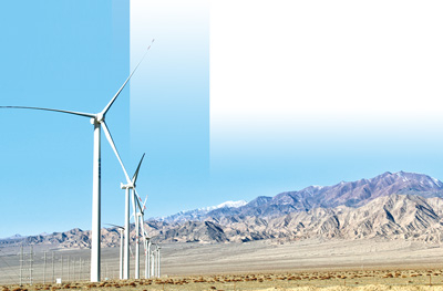 柴達(dá)木盆地上,巨大的風(fēng)力發(fā)電機(jī)正在運(yùn)轉(zhuǎn)。本報(bào)記者 姜 峰攝
