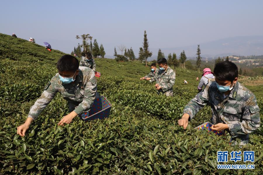貴州省六盤水市水城區(qū)人武部組織基干民兵和群眾一起采摘新茶(2020年2月25日攝)。新華社發(fā)(趙嬋娟 攝)