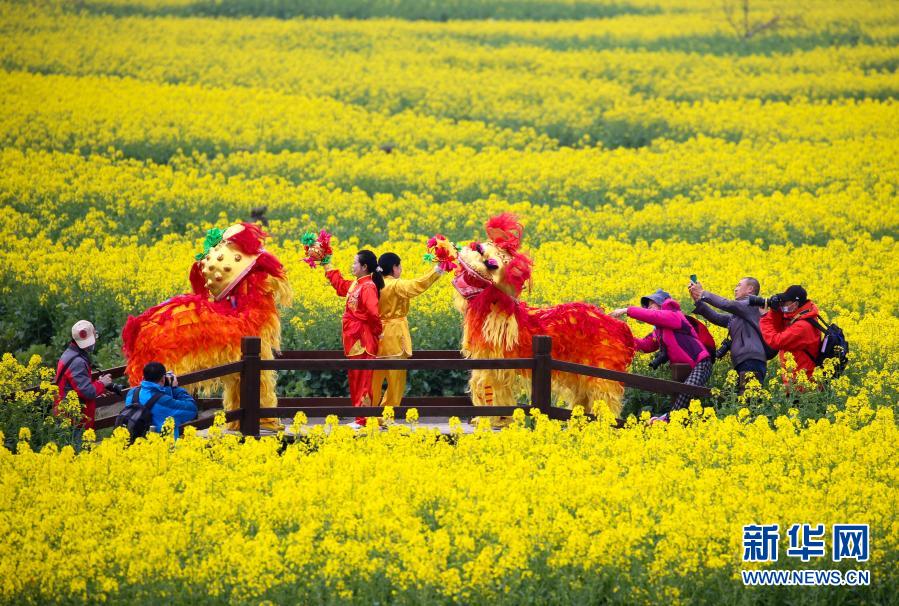 3月18日,人們?cè)谂d化市千垛景區(qū)進(jìn)行舞獅表演。 當(dāng)日,中國·興化千垛菜花旅游節(jié)在江蘇興化千垛景區(qū)拉開帷幕,吸引眾多游客前來踏青賞花。本屆菜花旅游節(jié)將持續(xù)到5月8日,期間還將舉行美食大賽、農(nóng)產(chǎn)品展示等活動(dòng)。 新華社發(fā)(湯德宏 攝)