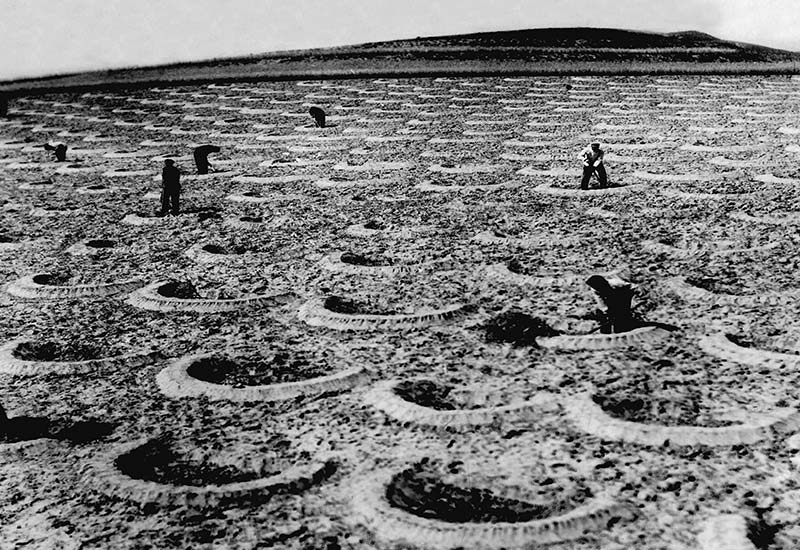 △20世紀(jì)六七十年代,右玉縣群眾在荒山植樹。