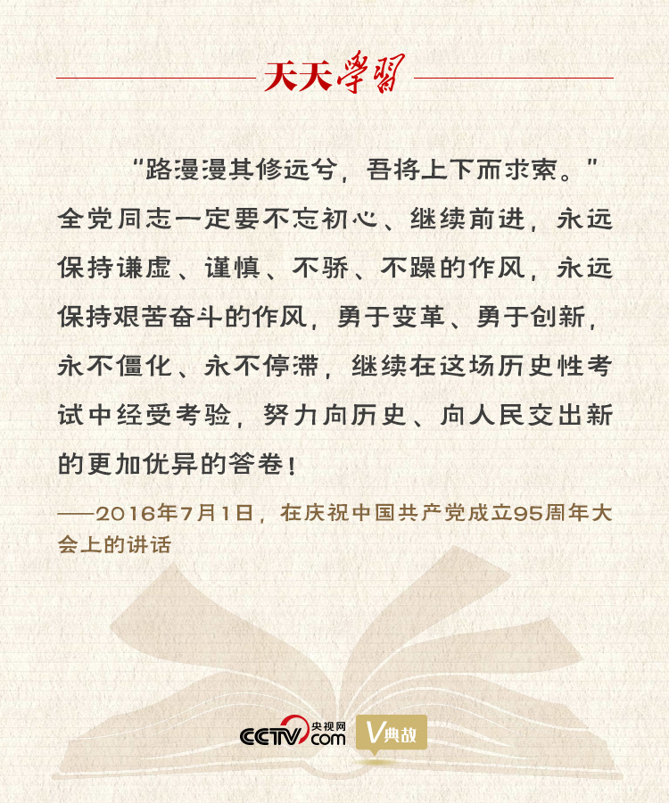 在慶祝中國共產(chǎn)黨成立95周年大會上的結(jié)束語,習(xí)近平總書記在重提“趕考”之后,引用了 “路漫漫其修遠(yuǎn)兮,吾將上下而求索”,強調(diào)這場考試還沒有結(jié)束,還在繼續(xù),今天,我們黨團結(jié)帶領(lǐng)人民所做的一切工作,就是這場考試的繼續(xù),激勵全黨同志一定要不忘初心、繼續(xù)前進。