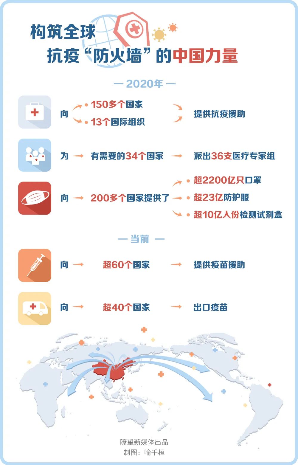世界聽到中國聲音,更見到中國行動。2020年,中國向150多個(gè)國家和13個(gè)國際組織提供抗疫援助,向有需要的34個(gè)國家派出36支醫(yī)療專家組,向200多個(gè)國家提供了超過2200億只口罩、23億件防護(hù)服、10億人份檢測試劑盒。當(dāng)前,中國已向超過60個(gè)國家提供疫苗援助,向超過40個(gè)國家出口疫苗,扎實(shí)履行將疫苗作為全球公共產(chǎn)品的大國承諾。