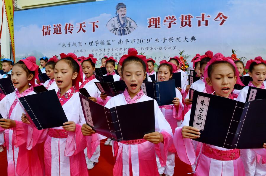 2019年10月18日,小學(xué)生在福建省建甌市舉行的朱子祭祀大典上誦讀《朱子家訓(xùn)》。新華社記者 張國(guó)俊 攝