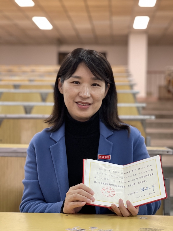 △這是閩江職業(yè)大學(xué)中文秘書專業(yè)1992屆學(xué)生任濤,她手里拿的是習(xí)近平當(dāng)時(shí)簽發(fā)的畢業(yè)證書。(總臺(tái)央視記者盧心雨拍攝)