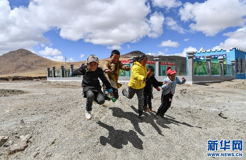在我國海拔最高的行政鄉(xiāng)——西藏山南市浪卡子縣普瑪江塘鄉(xiāng),小朋友們?cè)谛陆ǔ傻挠變簣@前玩耍(2020年4月16日攝)。新華社記者 晉美多吉 攝