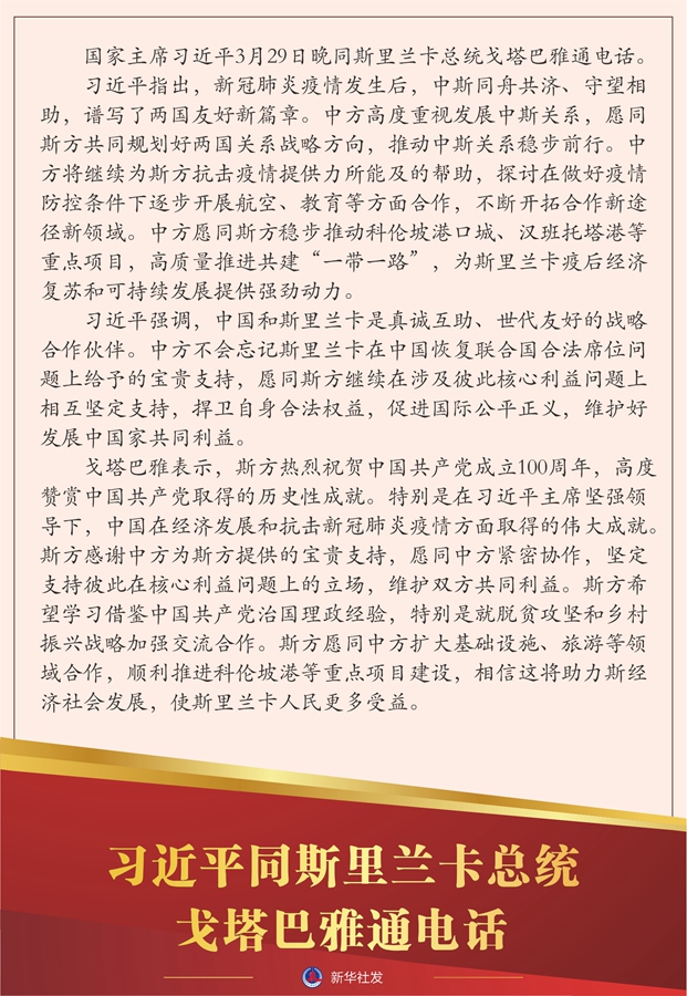新華社北京3月29日電 國家主席習近平3月29日晚同斯里蘭卡總統(tǒng)戈塔巴雅通電話。