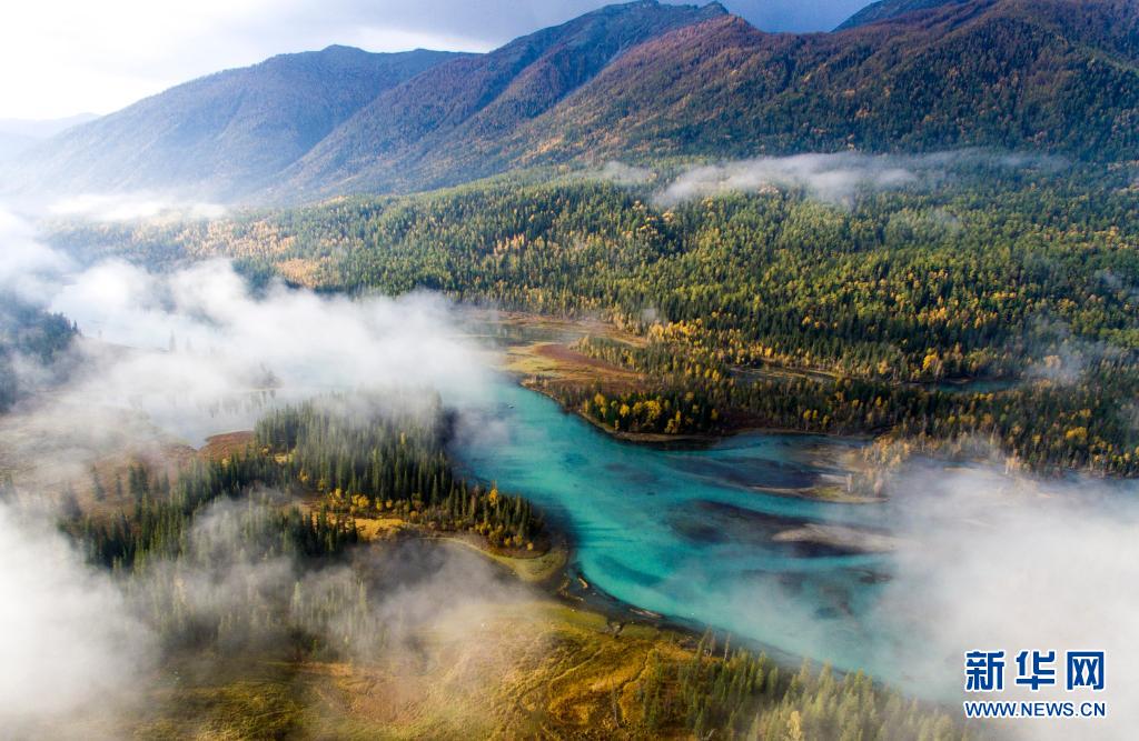 金秋時(shí)節(jié),新疆阿勒泰地區(qū)喀納斯景區(qū)內(nèi)的林木與喀納斯湖相互映襯,美不勝收(2019年9月24日攝,無(wú)人機(jī)照片)。
