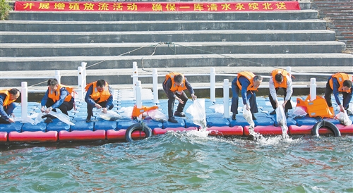 為保護(hù)丹江口庫區(qū)生態(tài),2020年相關(guān)部門聯(lián)合開展魚類增殖放流活動,將162.5萬尾魚苗放入丹江口庫區(qū)。(資料圖片)