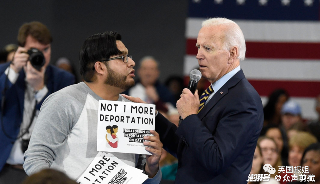 拜登競(jìng)選大會(huì)上與拿著“不再驅(qū)逐出境”的支持者