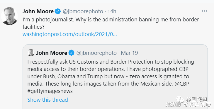 攝影記者John Moore在推特上質(zhì)問(wèn):“我謹(jǐn)請(qǐng)美國(guó)海關(guān)和邊境保護(hù)局停止阻止媒體訪問(wèn)邊境的行為。我在布什、奧巴馬和川普的領(lǐng)導(dǎo)時(shí)期都拍攝了這一地區(qū)的新聞圖片,但現(xiàn)在你們竟然禁止記者入內(nèi)了?”