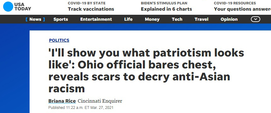 △《今日美國報(bào)》網(wǎng)站報(bào)道,俄亥俄州的官員展示胸部傷痕譴責(zé)美國歧視亞裔。
