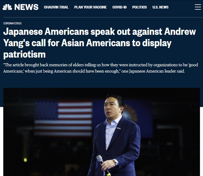 △美國全國廣播公司網(wǎng)站2020年報(bào)道,日裔美國人反對楊安澤呼吁的“亞裔應(yīng)展現(xiàn)出愛國主義”。