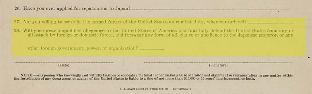 第28問:你是否誓言無條件效忠美國、忠實(shí)捍衛(wèi)美國免于任何來自國內(nèi)外的攻擊,并且放棄對日本天皇或其他外國政府與組織任何形式的效忠?