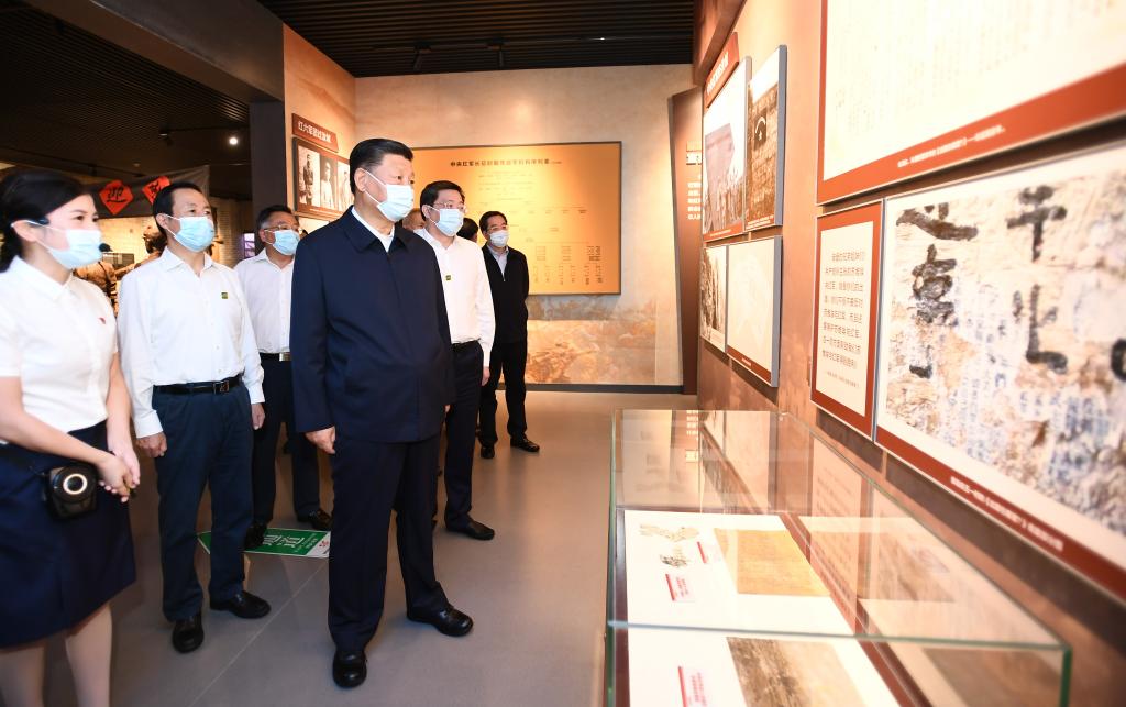 2020年9月16日,習(xí)近平在郴州市汝城縣文明瑤族鄉(xiāng)沙洲瑤族村“半條被子的溫暖”專題陳列館,了解當(dāng)?shù)亻_展紅色教育情況。(新華社記者 謝環(huán)馳 攝)