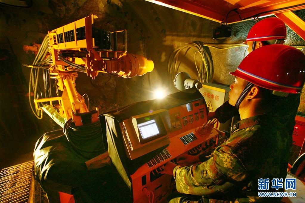 火箭軍某部官兵在掘進作業(yè)中操作全電腦鑿巖臺車鉆孔(2014年4月12日攝)。