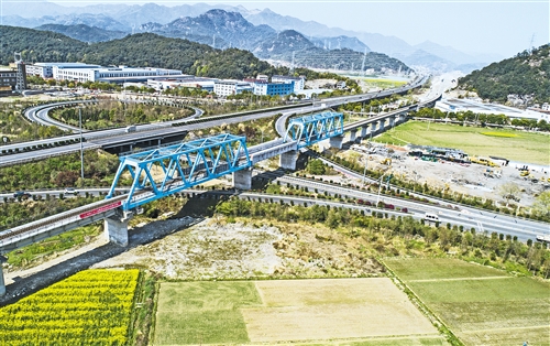 3月31日,中鐵二十二局集團(tuán)四公司參建的金臺鐵路正式完工。該鐵路是浙江第一條自主建設(shè)、自主運(yùn)營的電氣化鐵路,全長約232公里,設(shè)計(jì)時速160公里,預(yù)計(jì)今年6月開通運(yùn)營。圖為金臺鐵路跨臺金高速公路匝道特大橋?紫槲臄z(中經(jīng)視覺)