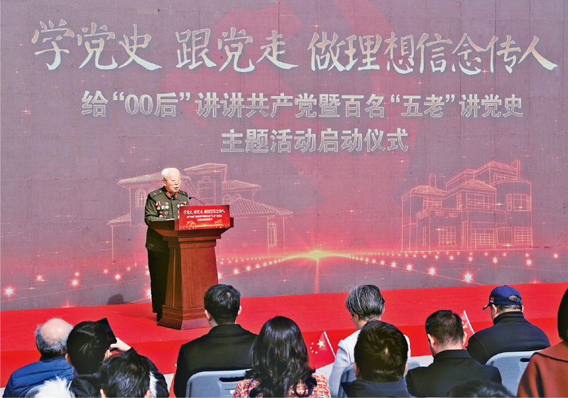 2021年2月23日,“學(xué)黨史 跟黨走 做理想信念傳人——給‘00后’講講共產(chǎn)黨暨百名‘五老’講黨史主題活動(dòng)”在位于上海市嘉定區(qū)的外岡游擊隊(duì)紀(jì)念館正式啟動(dòng)。本次活動(dòng)拉開(kāi)了上海教育系統(tǒng)黨史學(xué)習(xí)教育的序幕,將組織包括新四軍老戰(zhàn)士在內(nèi)的一批老干部、老戰(zhàn)士、老專(zhuān)家、老教師、老模范走進(jìn)校園,以“校外輔導(dǎo)員”的方式,參與大學(xué)和中小學(xué)的思想政治教育,教育引導(dǎo)青少年始終聽(tīng)黨的話、永遠(yuǎn)跟黨走。圖為上海市新四軍歷史研究會(huì)名譽(yù)會(huì)長(zhǎng)、九旬新四軍老戰(zhàn)士阮武昌在活動(dòng)現(xiàn)場(chǎng)講述新四軍的抗日故事。 新華社記者 劉穎/攝
