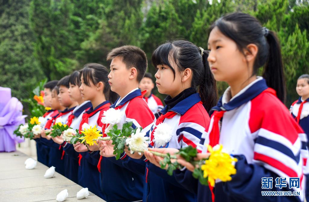 4月1日,在晉冀魯豫烈士陵園,邯鄲市邯山區(qū)農(nóng)林路小學(xué)學(xué)生向烈士公墓獻(xiàn)花。