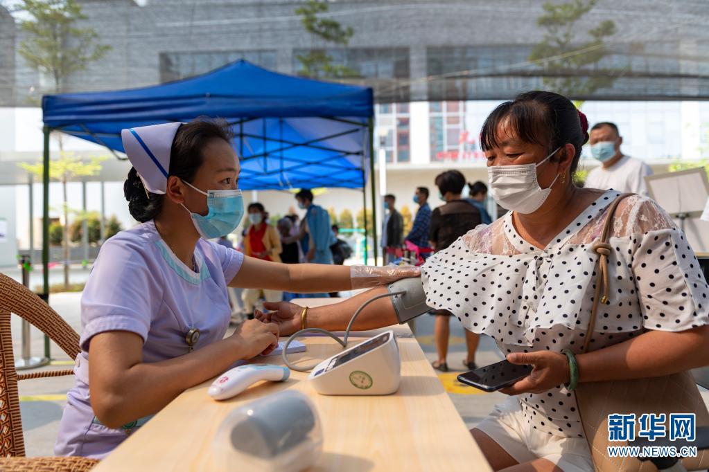 4月1日,一名女士在瑞麗市景成醫(yī)院新冠疫苗接種點測量血壓。