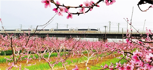 河南省寧陵縣柳河鎮(zhèn)桃源關(guān)村,一列動(dòng)車從桃花叢中疾馳而過。近年來,寧陵縣因地制宜著力打造“旅游經(jīng)濟(jì)”,助力農(nóng)民增收。呂忠箱攝