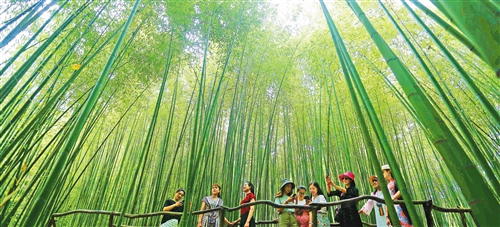 游客在山東省沂南縣銅井鎮(zhèn)竹泉村竹林棧道暢游,盡享春日美景。 王彥冰攝