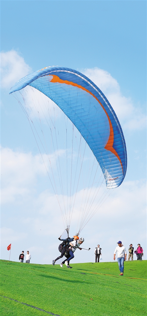 游人在重慶市北碚區(qū)天府鎮(zhèn)體驗(yàn)滑翔樂趣。近年來,北碚區(qū)致力于打造“處處是風(fēng)景、全城可休閑”的旅游休閑度假目的地。