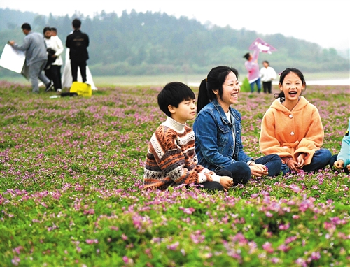 江西省樟樹市店下鎮(zhèn)夢(mèng)湖畔紫云英花盛開,游客在此賞景,盡享無限春光。 肖 龑攝