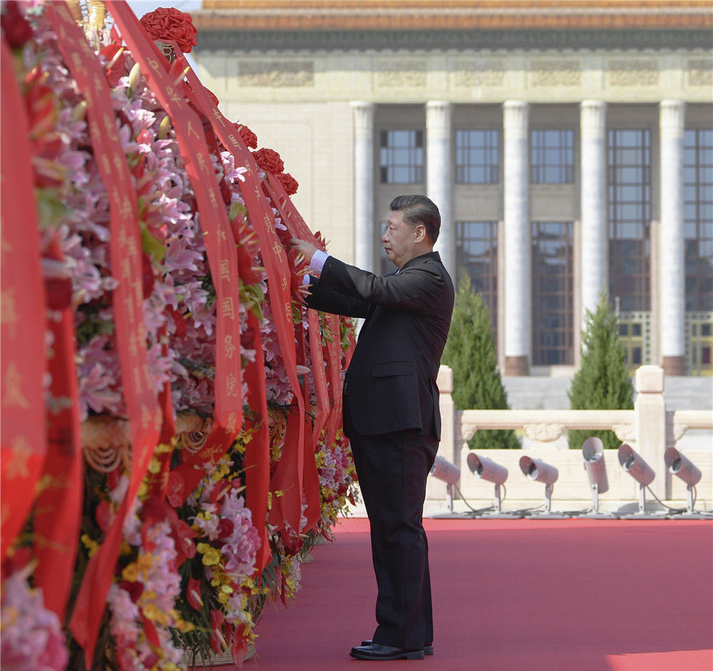 2020年9月30日,習(xí)近平出席烈士紀(jì)念日向人民英雄敬獻(xiàn)花籃儀式。這是習(xí)近平整理花籃上的緞帶。