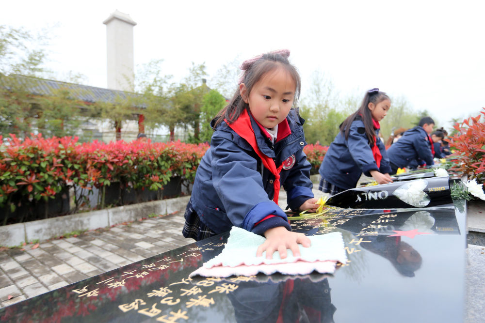 2021年4月1日,在安徽省淮北市相山區(qū)烈士陵園,淮北市泉山路學(xué)校學(xué)生擦拭烈士墓。